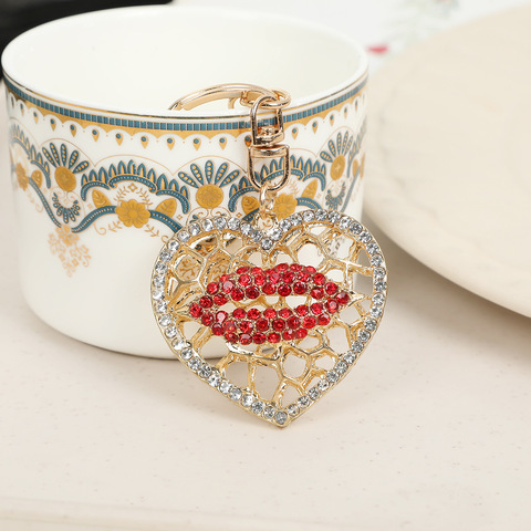 Yaratıcı moda kalp şeklinde dudak ile elmas ve kübik zirkonya kolye kişiselleştirilmiş Metal anahtarlık kadın çantası araba anahtarları için